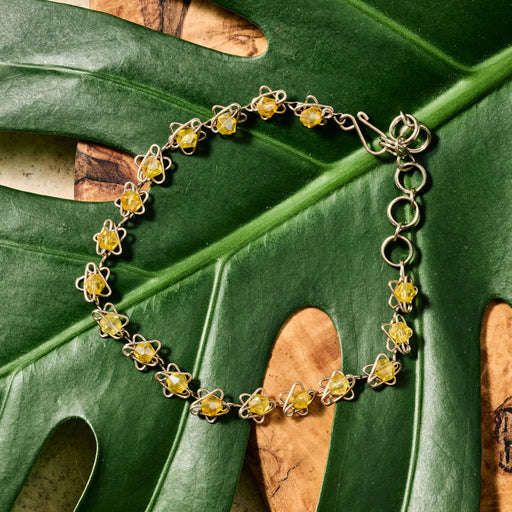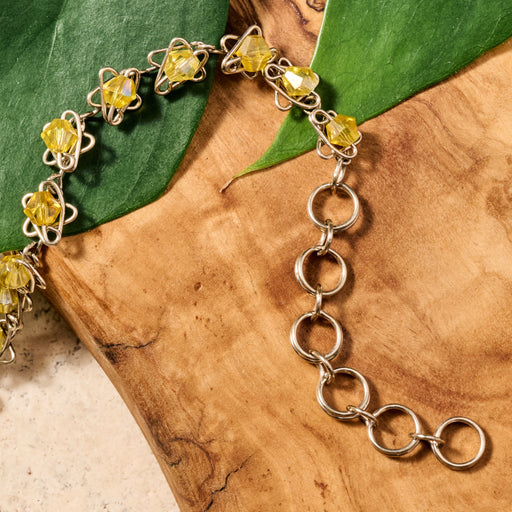 Add a pop of sunshine to your look with this handcrafted bracelet made from alpaca silver and bright yellow acrylic beads. Each folded link forms a...