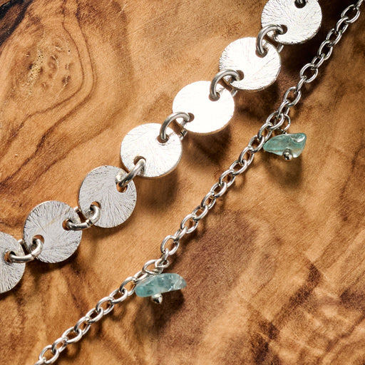 Handcrafted in IndiaLayered elegance with a fashion-forward edge! This double strand necklace features green uncut stones and shimmering copper discs linked by eye-cat...