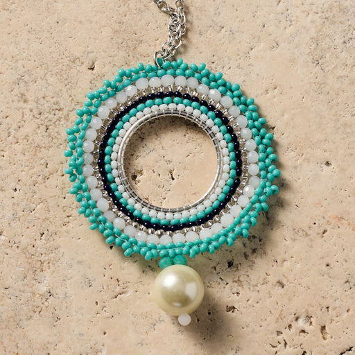 Handcrafted in IndiaElegant and eye-catching, this pendant necklace features a circle of shimmering glass seed beads in turquoise, black and silver. A luminous pearles...