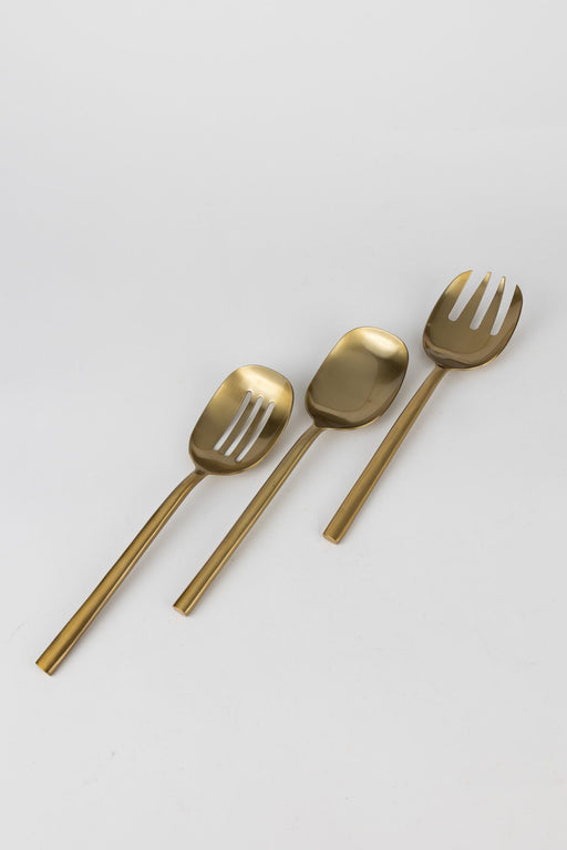 Handcrafted in IndiaServe it up elegantly with a set of three brass-plated stainless steel serving spoons. One pronged, one slotted, another forked. Be at the ready to...