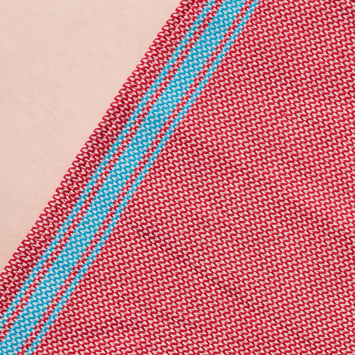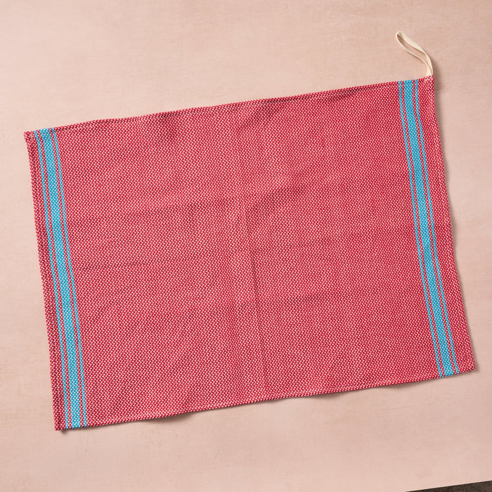 Brighten your kitchen with a pop of color and timeless charm. This striped woven tea towel blends function with simple elegance, featuring a refreshing red and white base accented by three bold aqua stripes at each end. Crafted from 100% cotton, it’s soft, absorbent and ready to tackle daily tasks - from drying dishes to lining a breadbasket. A convenient cotton loop in the corner makes it easy to hang and display. Whether you’re cooking up memories or cleaning up spills, this towel adds a cheerful, artisan touch to your routine. Handcrafted in Egypt.
