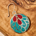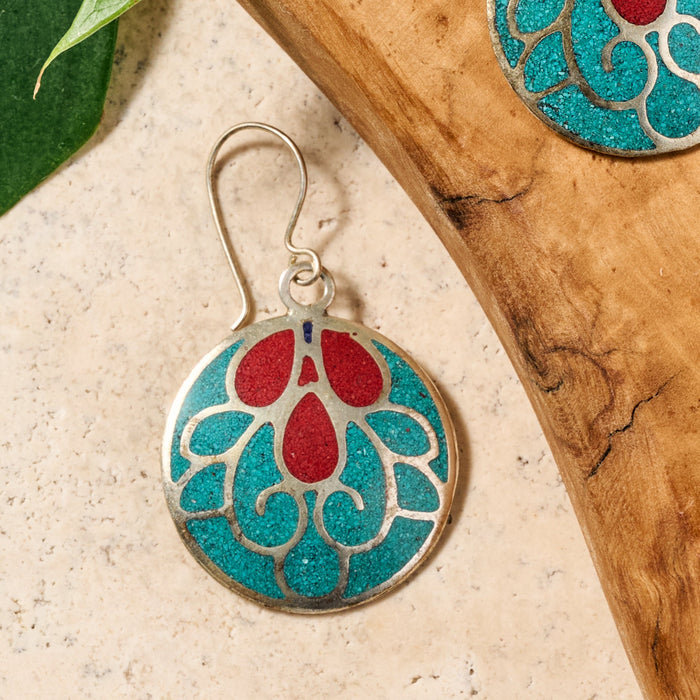 Add a bold pop of color to your look with these vibrant round dangle earrings. Handcrafted from silver electroplated brass, each piece showcases a stunning inlay of powdered stone in vivid red and teal tones. The intricate silver design layered over the surface adds dimension and elegance, catching the light with every turn. Lightweight and easy to wear with ear wire closures, these earrings are a perfect fusion of traditional craftsmanship and modern flair. A Ten Thousand Villages Exclusive handcrafted in Nepal.